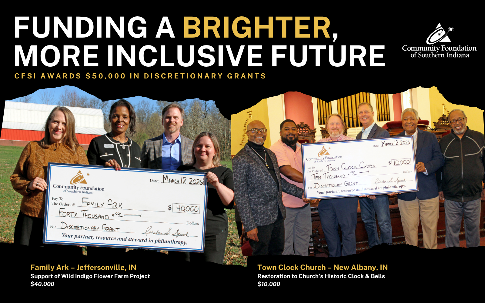In addition, CFSI awarded a $10,000 grant to Town Clock Church in New Albany to support urgent mechanical repairs to its historic clock and bell system. The repairs will restore full operation of the clock, preserving a highly visible landmark that has stood in the community for more than 170 years.